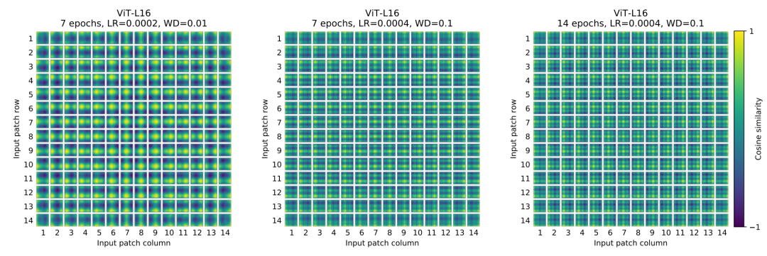 论文中也对学习到的positional embedding进行了可视化,发现相近的patchs的positional embedding比较相似,而且同行或同列的positional embedding也相近: