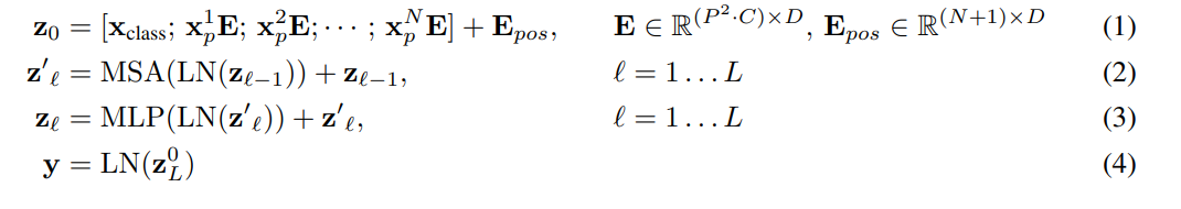 对于ViT模型来说,就类似CNN那样,不断堆积transformer encoder blocks,最后提取class token对应的特征用于图像分类,论文中也给出了模型的公式表达,其中(1)就是提取图像的patch embeddings,然后和class token对应的embedding拼接在一起并加上positional embedding;(2)是MSA,而(3)是MLP,(2)和(3)共同组成了一个transformer encoder block,共有层;(4)是对class token对应的输出做layer norm,然后就可以用来图像分类。