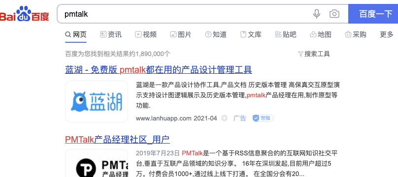 在百度、谷歌、搜狗上搜索PMTalk其实是没有搜索结果的。我们的用户都是通过收藏夹或域名直接输入。