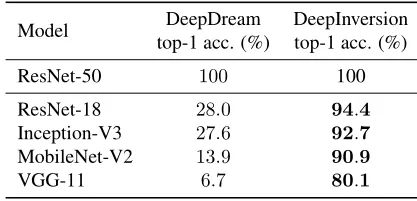 如下图17所示是其他4个训练好了的神经网络对 ResNet-50 合成图像的分类精度。DeepInversion 的表现远远优于 DeepDream。这表明 DeepInversion 所生成的图像在跨网络传输时具有鲁棒性。