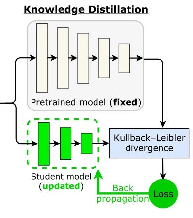 式中, 是训练集, 是教师模型, 是学生模型, 是学生模型的参数,Knowledge Distillation 就是最小化教师模型和学生模型输出的 散度。