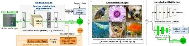 先看左边的第一部分,即 Adaptive DeepInversion。一张待优化的 noise 图片经过预训练好的 Teacher 模型得到输出 Teacher logits,经过预训练好的 Student 模型得到输出 Student logits,二者计算 JS 散度等等得到 ,通过教师网络计算得到 。之后通过 Teacher logits 和 标签的 CE Loss 得到 ,把它们加在一起作为最终的目标来更新这个待优化的 noise 图片。注意这步里面的 Student model 是一个预训练好的模型,不是后面那步的 Student model。
