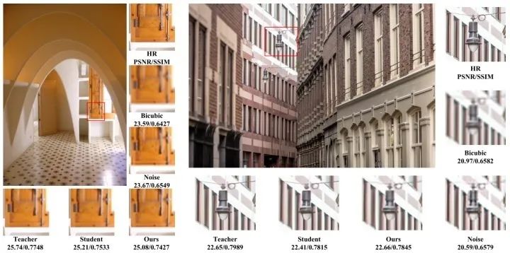 在图5中,作者可视化了由生成器 生成的几幅图像以及由教师网络生成的相应超分辨率结果。生成器 经过训练后生成的图片有了自然图像的感觉。