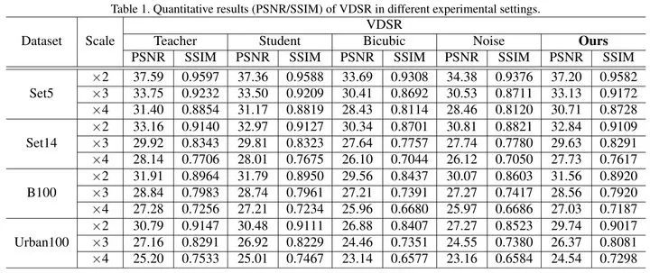在优化过程中,对于学生网络,学习速率最初设置为0.1,然后每10个 epochs 降低10倍。对于生成器,学习速率最初设置为1e-5,并根据与学生网络相同的策略进行衰减。此外,在整个训练过程中,我们每个 epoch 处理120次迭代,在每次迭代中,我们首先更新学生网络50次,然后更新生成器1次。重建权重 设置为1.0。此外,VDSR分为2个部分,分两个阶段进行培训。第一阶段训练12个 epochs,然后整个网络训练68个 epochs。