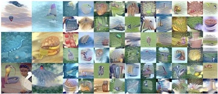 下图16是合成图片的可视化的结果。教师模型使用 ResNet-50。值得注意的是,仅给定 Teacher 的预训练模型,DeepInversion 就已经能够生成高保真度和高分辨率的图像。它还产生目标物体周围的详细图像特征和纹理,例如目标气球周围的云、船周围的水、火山下面的森林等。