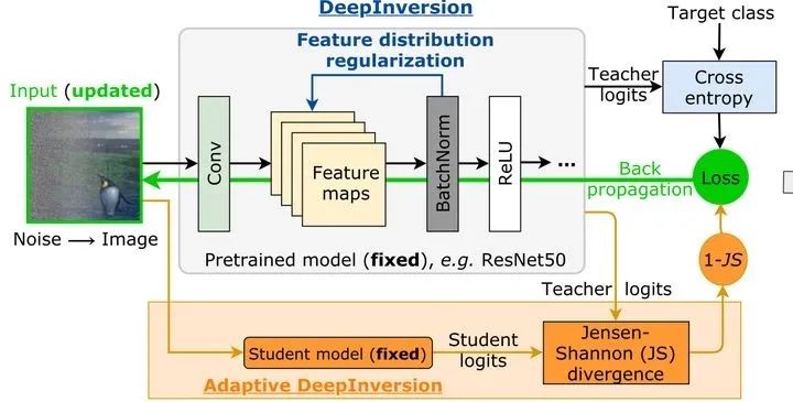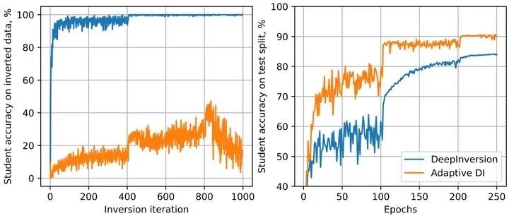 Adaptive DeepInversion 的竞争性和互动性有利于不断进化的学生,这逐渐迫使新的图像特征出现,并使得 DeepInversion 得到增强。
