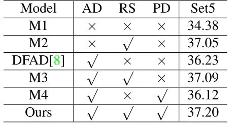M1表示用从随机均匀分布中采样的图片做蒸馏,PSNR仅达到34.38dB。 M2表示仅仅使用生成器 的重建损失,即6式,发现PSNR达到37.05dB。 M3表示将对抗损失和重建损失相结合,可以获得显著更好的性能,PSNR达到37.09dB。 进一步应用渐进蒸馏方法带来了 PSNR 0.11dB 的增加,说明渐进蒸馏可以改善性能。
