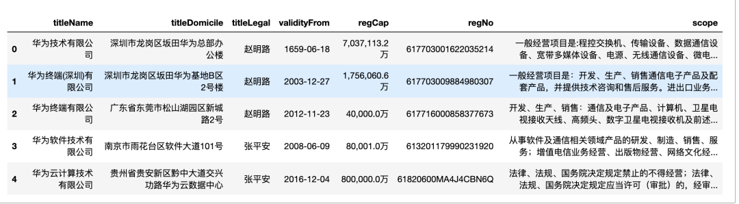 {'pid': '28610144220343', 'entName': '<em>华为</em>终端(深圳)有限公司', 'entType': '有限责任公司(外商投资、非独资)', 'validityFrom': '2003-12-25', 'domicile': '深圳市龙岗区坂田<em>华为</em>基地B区2号楼', 'entLogo': 'https://zhengxin-pub.cdn.bcebos.com/logopic/a638462a7a48ab79f84b7db2c0e64230_fullsize.jpg', 'openStatus': '开业', 'legalPerson': '赵明路', 'tags': {'laTaxer': '<span class="zx-ent-tag laTaxer">A级纳税人(2020)</span>'}, 'logoWord': '华为终端', 'titleName': '华为终端(深圳)有限公司', 'titleLegal': '赵明路', 'titleDomicile': '深圳市龙岗区坂田华为基地B区2号楼', 'levelAtaxer': [2020, 2018, 2019, 2016, 2017, 2014, 2015], 'regCap': '1,598,080.8万', 'scope': '一般经营项目是:开发、生产、销售通信电子产品及配套产品,并提供技术咨询和售后服务。进出口业务(不含分销)。,许可经营项目是:', 'regNo': '815503006447640305', 'hitReason': [{'企业名称': '<em>华为</em>终端(深圳)有限公司'}, {'网站名称': '<em>华为</em>HARMONYOS网站'}, {'地址': '深圳市龙岗区坂田<em>华为</em>基地B区2号楼'}], 'labels': {'opening': {'text': '开业', 'style': 'blue', 'fontColor': '#1EA930', 'bgColor': '#EBF6EC'}}, 'personTitle': '法定代表人', 'personId': 'a9f275934f59110096757b656ba41382'}