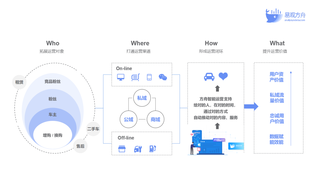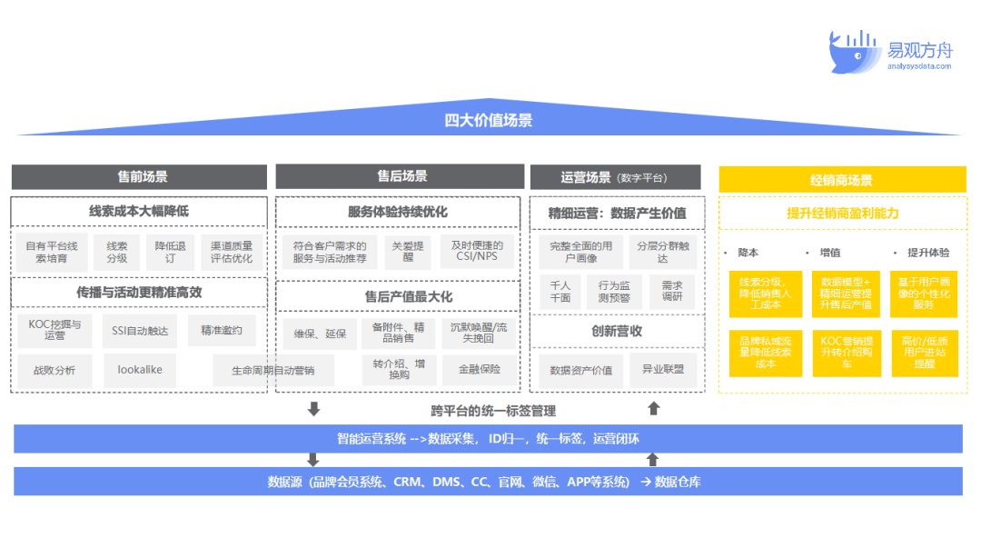 在实践中,车企的最终目标是基于大数据与用户标签画像,实现用户全生命旅程的数字化运营,赋能业务场景,提升价值转化。此时需要关注智能运营体系的四大价值场景,有针对性地制定运营策略: