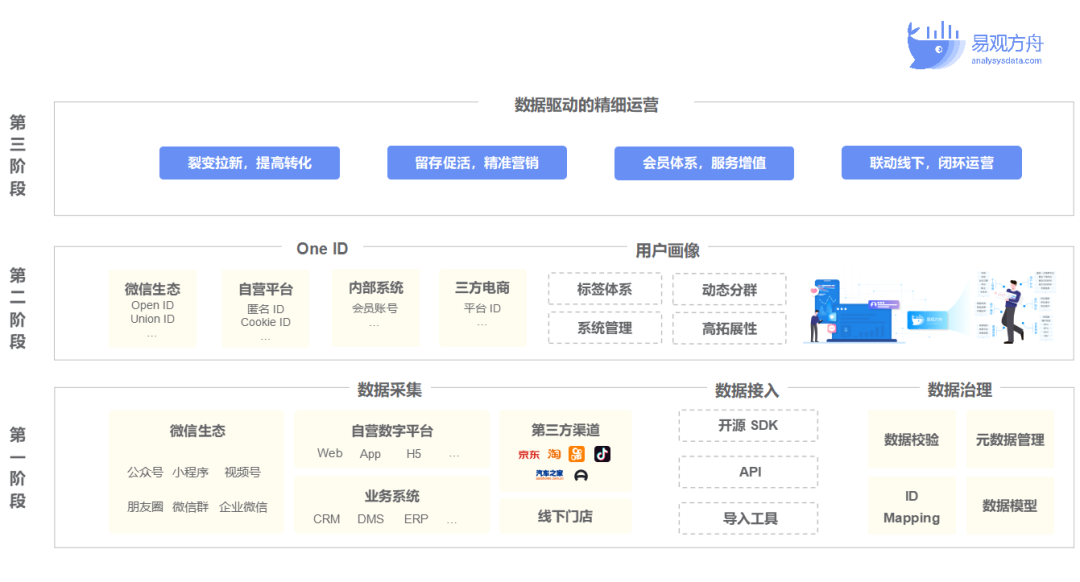 在实际的数据体系打造过程中,易观方舟服务的车企客户有些选择优先完成全场景的底层基建,打通所有用户数据,再逐步实现用户标签化和后续的数据治理。