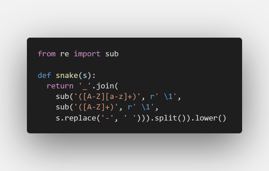 snake('some-mixed_string With spaces_underscores-and-hyphens')# 'some_mixed_string_with_spaces_underscores_and_hyphens'