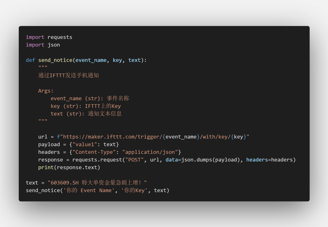 其中,你还可以带三个参数,以json格式放在body中,如 {"value1": "这是一个测试"},最终通知里的Value1会被这个value1替代。