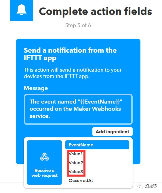 其中:{{EventName}}是我们前面设定的事件名称,而Add ingredient里面的value1、value2、value3则是服务器端发送http请求时带的参数。