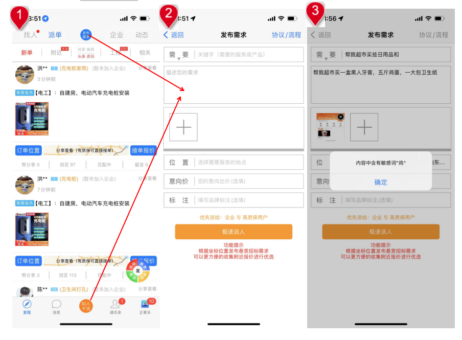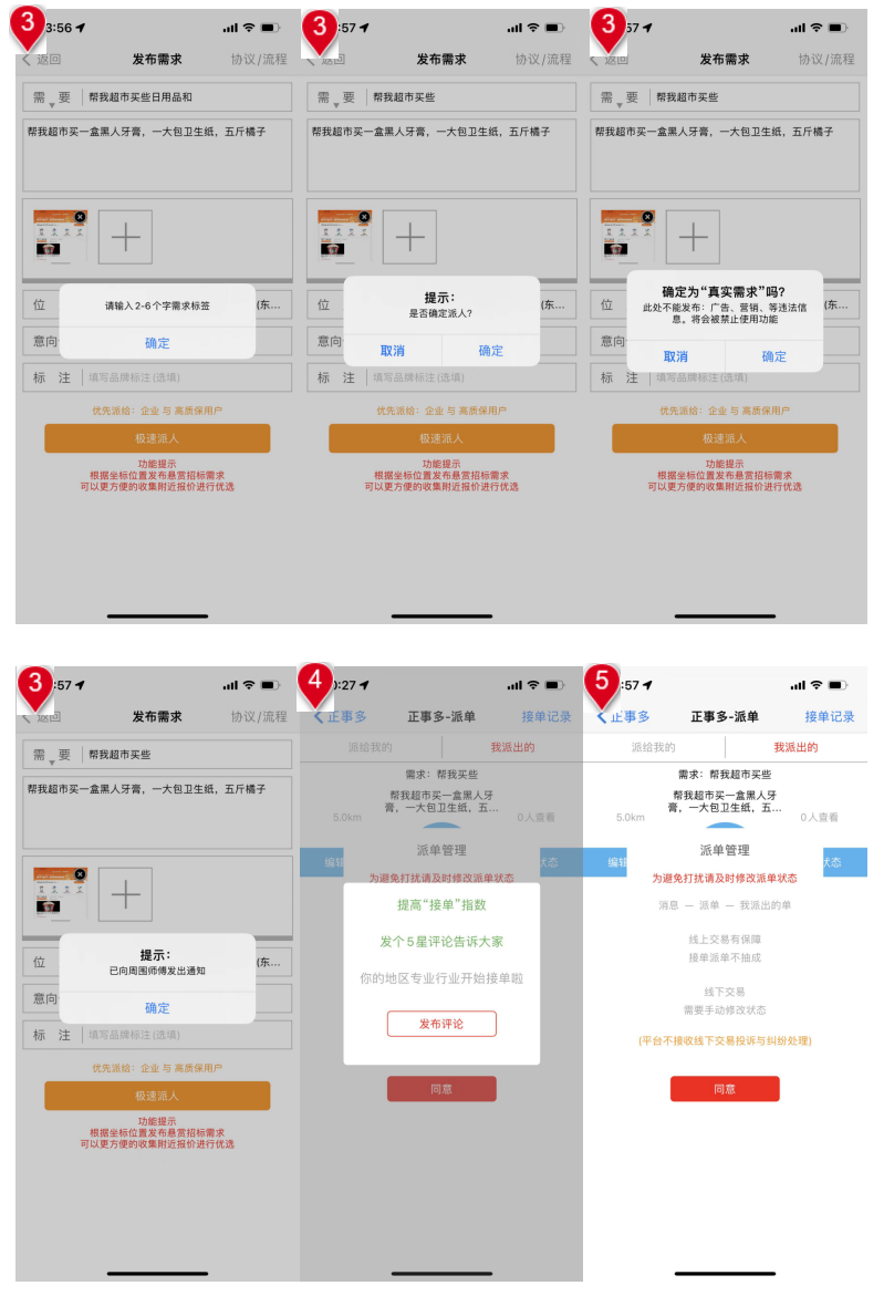 整体来看,需求填写页面过于简单,用户在发布需求的时候,有些问题考虑不全,导致需求不明确,产品应该帮用户把可能的问题罗列出来,供用户选择,帮助用户更明确的表达自己的需求。而且给用户的填写提示不合理,比如“需要”只能输入2-6个字,但是他最后才提示用户。具体需求描述的敏感字check不合理,如图所示。提交订单的弹框提示信息过多,这些注意事项本应该再用户提交之前了解,正事多这样的处理方式会让用户很烦。提交成功后同样弹框过多,其中有一个不仔细看都没有发现他是弹框提示,而且这个提示没什么作用。正事多简单把附近的所有用户按距离降序排列显示,连用户自己也在内,不合理。