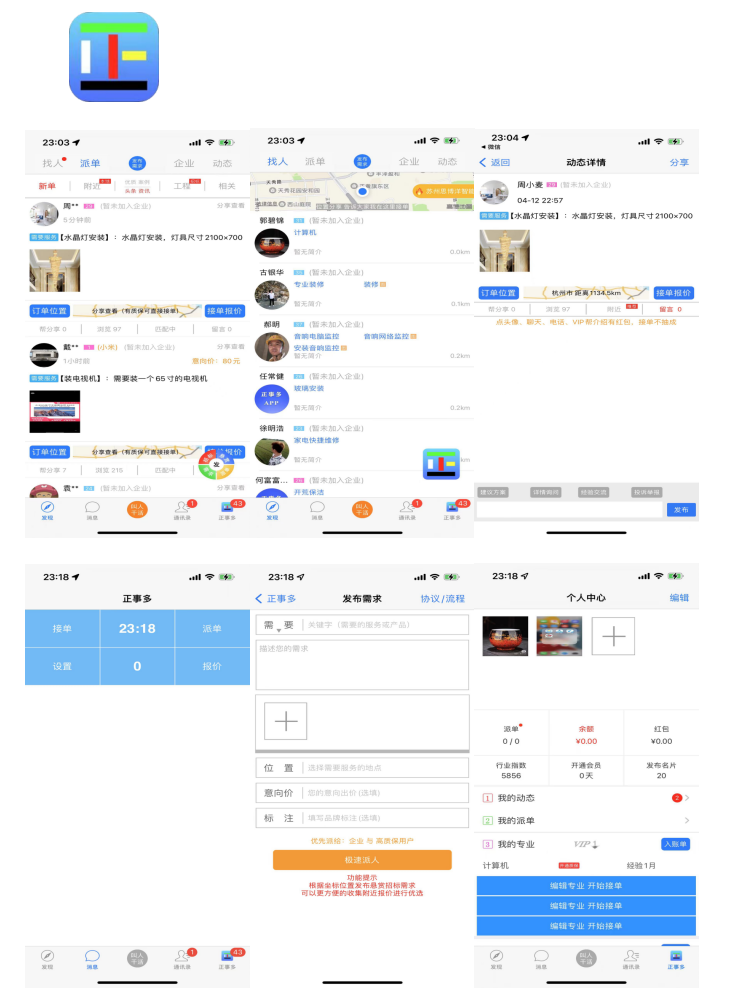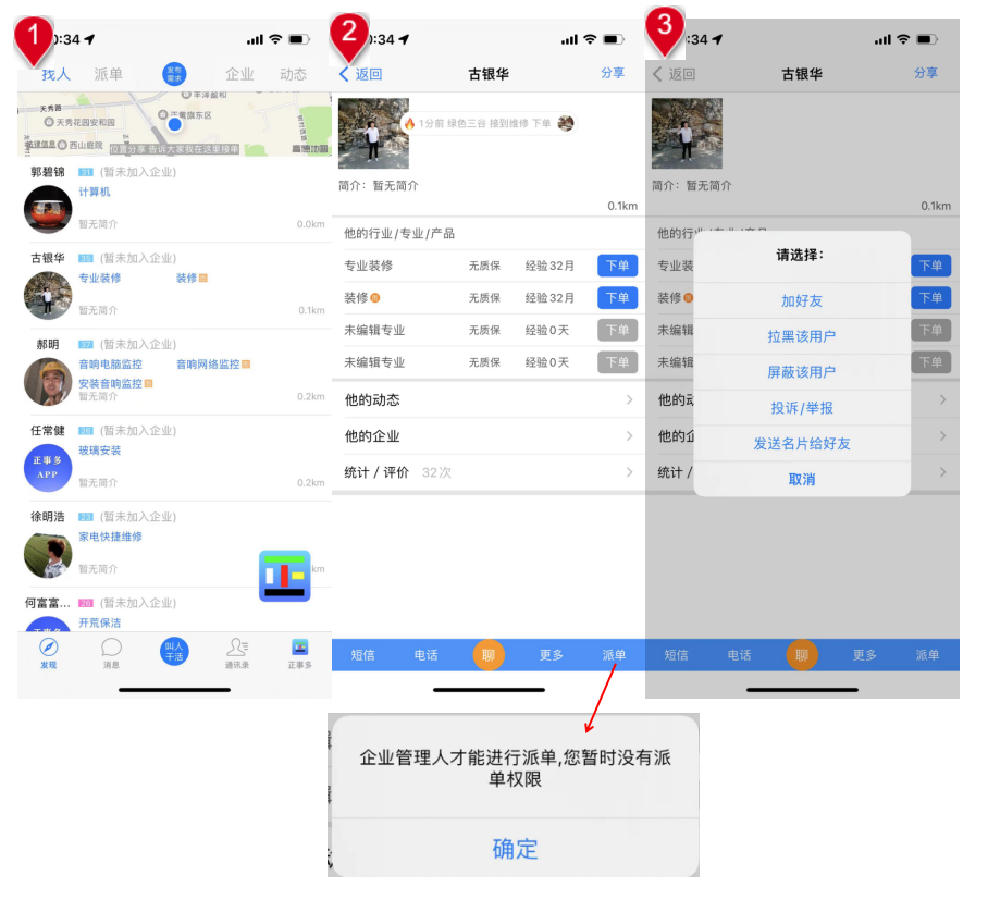 用户详情页,可以短信、电话、在线联系该用户,还可以加好友、拉黑、屏蔽、投诉、分享其名片,甚至可以给他下单。但是下单完成后,该订单没有指定下给该用户,跟正常下单结果是一样的,谁都能接。但是,页面下方的[派单]提示只有企业管理人才可以派单,这又是什么鬼。一些企业或者商户可以入驻正事多,用户可以按照人数、经验、质保降序排列,或者进行关键字搜索。用户可以再第2层页面对该企业或商户主营业务下单。