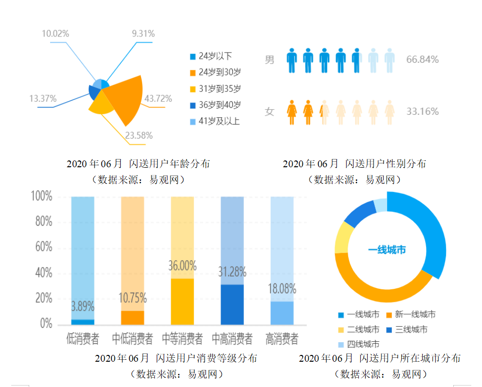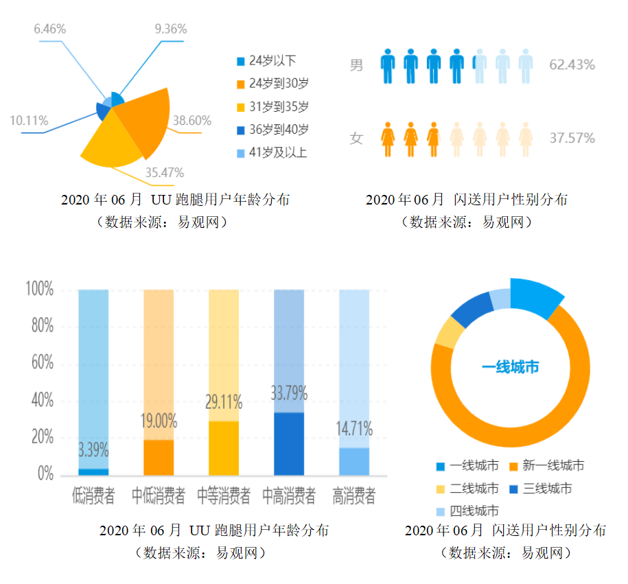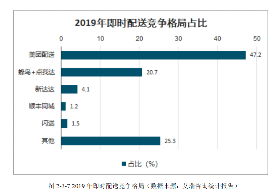 (4) 即时物流竞争格局:美团、饿了么两家独大,其他平台紧跟其后,行业竞争激烈外卖O2O平台:主要包括美团的专送团队、饿了么的蜂鸟配送。从即时物流发展历程看,高速发展期的即时配送业务量主要来自餐饮外卖领域,因而靠着外卖平台的大额订单输入,绑定与外卖平台的即时物流发展迅速,逐渐成为主流企业,占据了绝大部分市场份额。值得一提的是,随着消费者对本地生活各方面配送需求的扩大,这些平台也开始将业务从外卖扩展到水果生鲜、药物、日用品等生活消费的方方面面,利用其先发优势继续发展。即时配送物流企业:包括新达达、点我达、闪送、UU跑腿、邻趣、爱跑腿。虽然该类企业没有外卖平台持续的订单输入,但是其依然深受资本市场青睐。其中,点我达从成立至今已获得多轮融资,并于 2020 年被阿里旗下菜鸟网购全资收购,成为阿里系在即时物流领域的重要布局。生鲜O2O平台:主要有盒马生鲜、每日优鲜、易果生鲜和百果园。生鲜 O2O 为新零售的重要组成部分,发展前景明朗且发展速度快,因而增加了即时配送的需求;考虑到生鲜配送的特殊性(与一般外卖相比),生鲜O2O平台均采取自建即时物流团队的方式,从而生鲜 O2O平台物流团队是即时物流行业中的有力竞争者。如图2-3-7,2019年即时物流行业中的美团配送、蜂鸟配送(含点我达,负责饿了么众包配送)和新达达占据前三席:美团配送日均单量约2390 万单,市占率为 47.2%,位居首位;蜂鸟+点我达日均单量约 1050万单,市占率为20.7%,行业逐步呈现寡头竞争格局。(5) 低服务质量、服务单一与用户需求高要求化、多样化之间的矛盾报告显示,2019年,通过美团平台获得收入的骑手总数达到398.7万人,比2018年增长了23.3%。在所有骑手中,77%的骑手来自农村,男性骑手占比为93.3%;20-40岁骑手的占比达到83.7%,高中及以下学历占比超过 82.0%.饿了么因其入行门槛低、收入相对较高、职业相对自由等特点,吸引了大批社会闲置劳动力的加入。据《2020饿了么蓝骑士调研报告》显示,目前,饿了么平台骑手总数已超300万。其中,八成蓝骑士来自农村。即时物流行业无论是众包、加盟还是自建,从业人员素质较低,流动性较大是目前制约服务质量提升的关键症结。物流配送服务属于底层物流服务,并不需要较高的专业技能和学历要求。而且目前各家的主营业务还是实物配送,即时服务还有很大发展空间。疫情的持续,本地生活服务“到家”市场的迅速发展产生了更多本地化、个性化、多样化的需求。用户逐渐希望产品能够帮助解决自己更多的难题,期待产品的“百用感”;同时,也会希望产品在疫情期间能够给到自己安全感,表现得足够“体贴”。二者之间的矛盾必然愈演愈烈,“实物到家”只是我们生活中的一少部分,人们正逐渐追求“服务到家”。虽然现在市面上很多“到家”类APP(58到家、京东到家、天鹅到家等),但是他们的从业人员仍然和跑腿骑手有相同的问题。在各种各样的难题中,单靠他们也许解决不了问题,这就要求从业人员有更强的解决问题的能力以及更高的专业素养,比如:技能要求、专业要求、职业要求、学历要求、性别要求等。用户可能需要同阶层甚至更高阶层的人来满足其需求,所以我们要在产品中引入这一阶层的服务提供者。4、即时物流与生活服务发展趋势——下沉市场、场景拓展、服务模式改善即时配送是本地生活服务的神经网络。眼下,消费者越来越愿意为便利服务买单,外卖、跑腿帮办、生鲜到家、文件闪送等等,配送的品类越来越丰富,即时配送已经完全融入人们的日常生活。目前本地生活服务平台在一线、二线城市市场较为成熟且稳定,对于本地生活服务的消费意愿也因此更强,但服务范围及服务受众的发展遭遇瓶颈 ,需通过创新服务模式开发潜在客户 ,度过发展难关。而随着一二线城市本地生活服务市场竞争趋于白热化,未来下沉市场和场景拓展将成为本地生活平台竞争的焦点。UU跑腿就是“农村包围城市”的例子。数据显示,从2014年至2018年,中国本地生活综合服务市场规模以年复合增长率41.3%的惊人速度在扩大,在数字化升级推动下,即将进入万亿元市场。据测算,市场规模将在2024年达到2.8万亿元。艾瑞咨询的最新数据统计显示,万亿级的庞大市场之下,生活服务渗透率也仅有12.7%。这意味着在深入渗透的赛道上,谁跑得更快,谁就能多分一杯羹。总结:跑腿=即时物流+即时服务,目前即时物流市场发展已经遇到瓶颈,各企业都在转向即时服务,拓展服务范围及服务受众,即时服务行业将迎来快速发展。