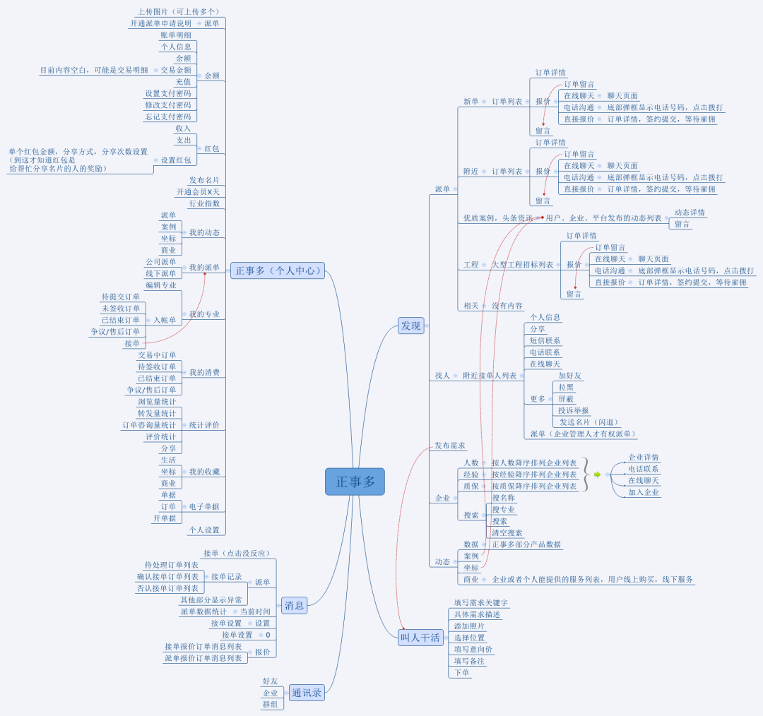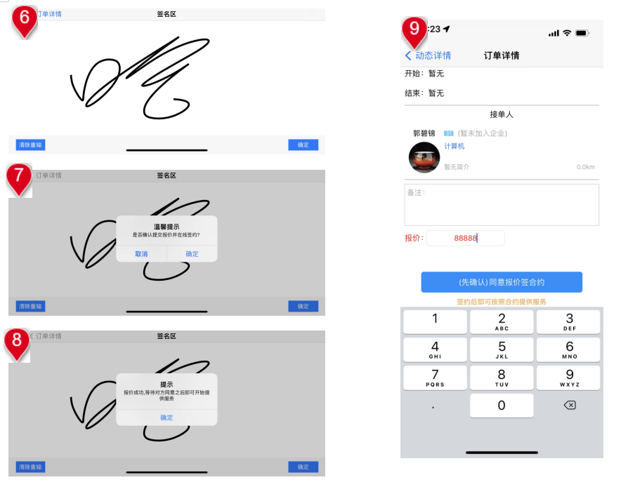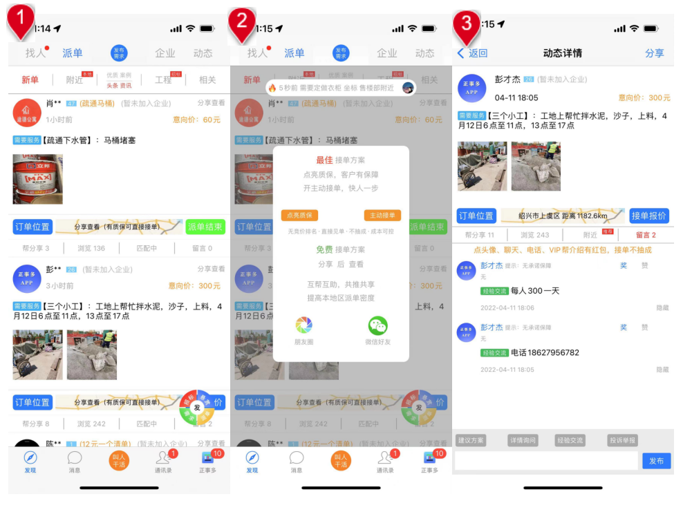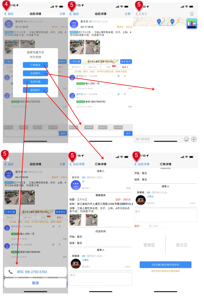 点击动态列表中的一条,非会员需要分享一次,再刷新页面一次,才能点击动态到动态详情页,该页面中可以留言、查看动态位置、接单报价。点击[接单报价]弹框提示,到第4层页面。点击[订单留言]再回到第3层页面,点击[在线聊天]到聊天页面,点击[电话沟通],底部弹出对方电话号码,点击[直接报价],到订单详情页。输入报价,点击[(先沟通)提交报价签合约]按钮,第一次弹框提示用户要先跟对方电话沟通,取消之后再次点击按钮,到签名页面,签过名点击[确定],弹框提示确认报价,点击[确定],弹框提示报价成功,等待对方同意,再次点击[确定],回到订单详情页面,用户也不知道签的字签哪里了。1. 非会员分享一次后需要刷新一次页面才能点击查看订单详情,一次刷新可能导致用户找不到刚才的订单,或者需要向下翻找很久,这会使大多数人放弃使用,直接卸载。“会员”的目的是为用户提供更好的服务,而不是为用户提供正常的服务。2. 点击[订单报价]后的弹框中,有四个功能:订单留言、在线聊天、电话沟通、直接报价。用户都决定点击报价了,还留言干嘛,聊什么天,打什么电话。应该把前三个功能做到动态详情页面,方便用户联系下单人。3. 订单详情页面的约定时间是假的,平台都没有让下单人填写约定时间,欺负老实人。接单人就是自己,不需要给自己展示自己的信息。4. 用户最后签的字不知道签哪里了。签字区没实质作用,提交报价后,页面虽然有提示信息,但仍然停留在订单详情页面,给用户的反馈不够。我电话访问过几个正事多接单的用户,他们都是一些劳动人民,因为接单流程繁琐,效率低,他们一般不在正事多上成交,他们把正事多当成一个信息发布平台,看到有人发单,直接打电话过去了解情况,完成任务后通过微信或者支付宝结账,由此可见,正事多这种模式不是不抽佣,而是无佣可抽。即使不抽佣,也应该简化接单流程,提升用户体验,有用户,有流量,才能更好的盈利。不知道为什么,要设计两个需求发布入口,一上一下,有时候蓝色,有时候橘色,难道是为了好玩?还是对称?