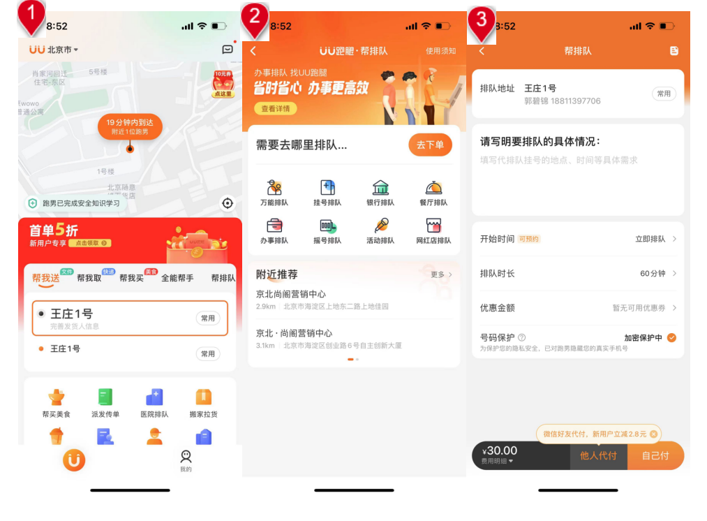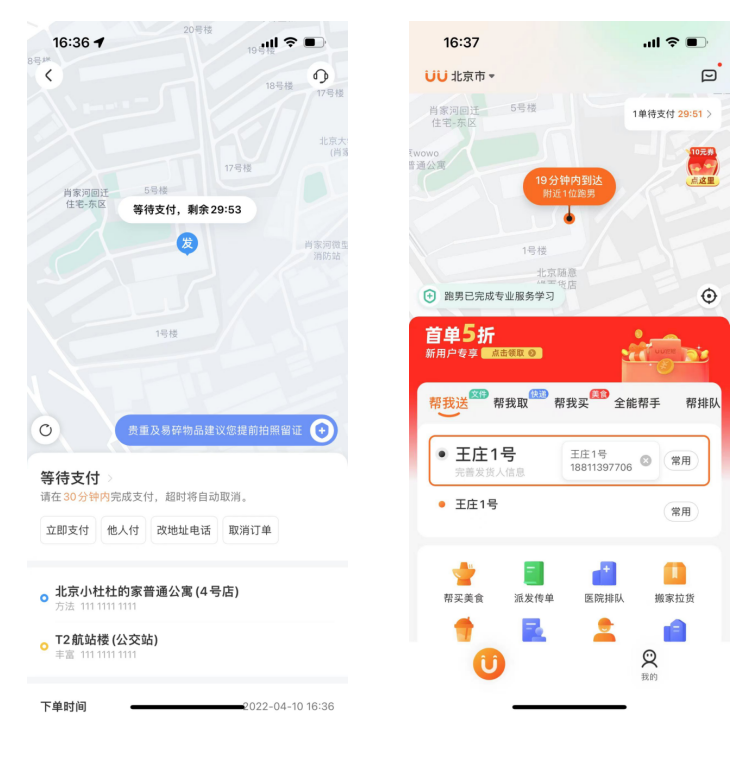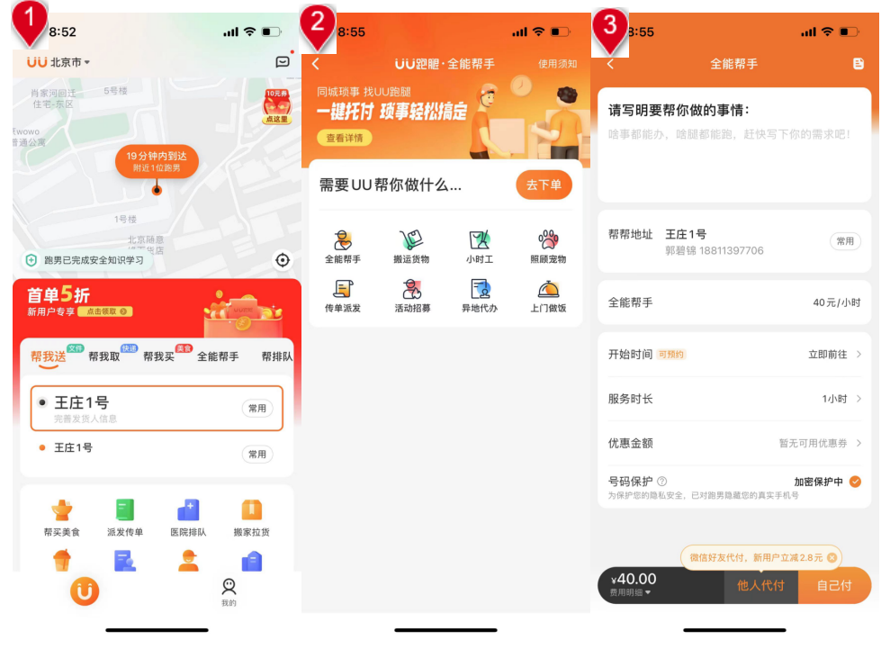 UU跑腿:点击帮买→选择帮买物品种类→填写帮买物品信息及详细要求、填写地址及附加服务并且付款。由此可见,闪送的帮买流程比UU跑腿的合理。闪送第2层页面用来填写帮买物品信息及详细要求,可根据用户选择的物品种类,有不同且完善的提示信息,帮助用户快速填写。而UU跑腿第2层页面的作用,只是给第3层页面的提示信息不同,而且提示信息不完善,没有实质性的作用,改进点:要么按照闪送的方式,要么把第2层页面删掉。1. 商品费用的支付方式。二者都可以先“预估费用”,骑手帮忙垫付,帮买完成之后再结算,但是UU跑腿可以直接把商品费用和跑腿费统一结算,这种结算方式使用频率应该不高,其中存在的问题是,如果商品实际费用比支付的多或者少,还需要再做一个功能来解决这个问题,很有可能出力不讨好。2. 商品从哪里购买。二者都有“指定地址”或者“就近购买”可供用户选择,这点很符合用户使用场景。但是闪送的交互设计明显比UU跑腿来的直观,其中闪送再第2层页面给用户的提示有“按图购买”,但是没有上传图片的功能。UU跑腿同样也没有上传图片的功能,这种场景频率其实还挺高的,如果用户描述不准确,只能用图片来表达,但是也可以用在线聊天的方式实现。帮排队其实也在全能帮的范畴内,为什么要单拿出来呢,应该是为了方便宣传吧,难道是因为帮排队的使用频率较高?不见得。我们可以把二者放在一起看。帮排队和全能帮虽然是UU跑腿的两大亮点,但不是他前期的业务重心,由上文分析可知,这是UU跑腿今后要重点发展的业务,也是我们要关注的领域。业务流程的问题还是第2层页面对第3层页面来说没有实质性的作用,完全可以用一个页面实现。不同类型的全能帮订单在第3层页面的设计大同小异,只是几个关键字的区别,其功能设计和收费方式可以参考。UU跑腿全能帮目前存在最大的问题是:这种下单模式只能满足人们的部分需求,而且是简单需求,仍然有很大部分需求无法满足。场景一:张三想举办一个活动,要招募20个人,如果用UU跑腿,他需要下20个订单,如果人数更多呢。就算张三下了20个订单,UU跑腿的收费方式张三会买单吗。场景二:张三想学电吉他,就是平时玩儿玩儿,报名培训班又觉得太贵,就想着能在附近找一个会电吉他的人,一起交流一下,指导他一下,哪怕支付一点报酬,用UU跑腿下单全能帮大概率找不到这样的人。面对未来用户需求的多样化和个性化,对于UU跑腿来说,这将是个巨大的挑战。正事多初始页面本来是“发现-找人”页面,再自动滑倒“派单”页面,给用户一种不舒服的感觉。