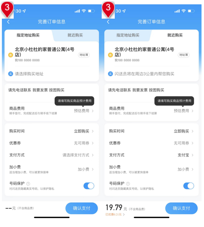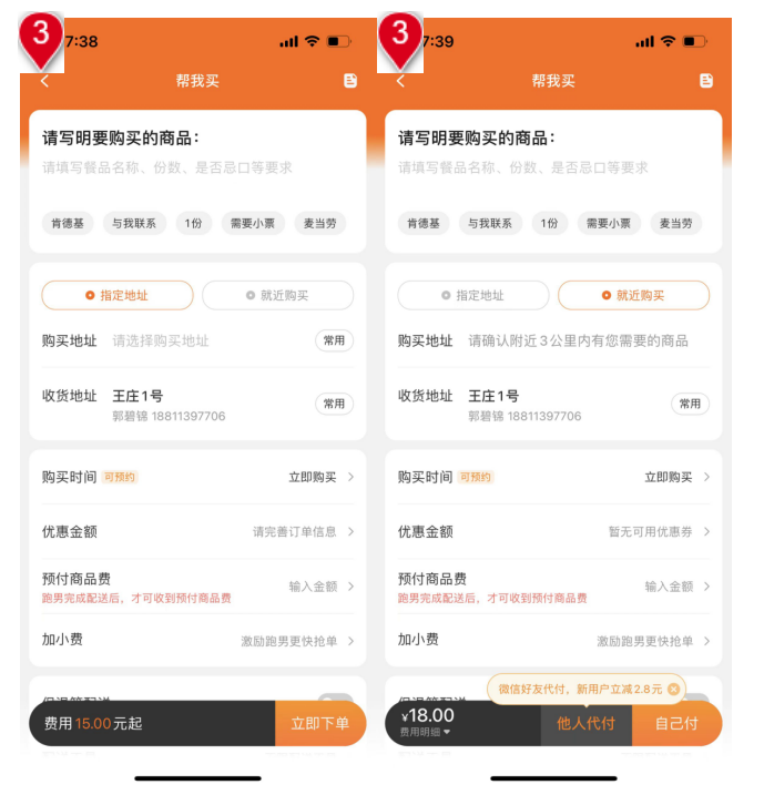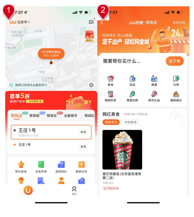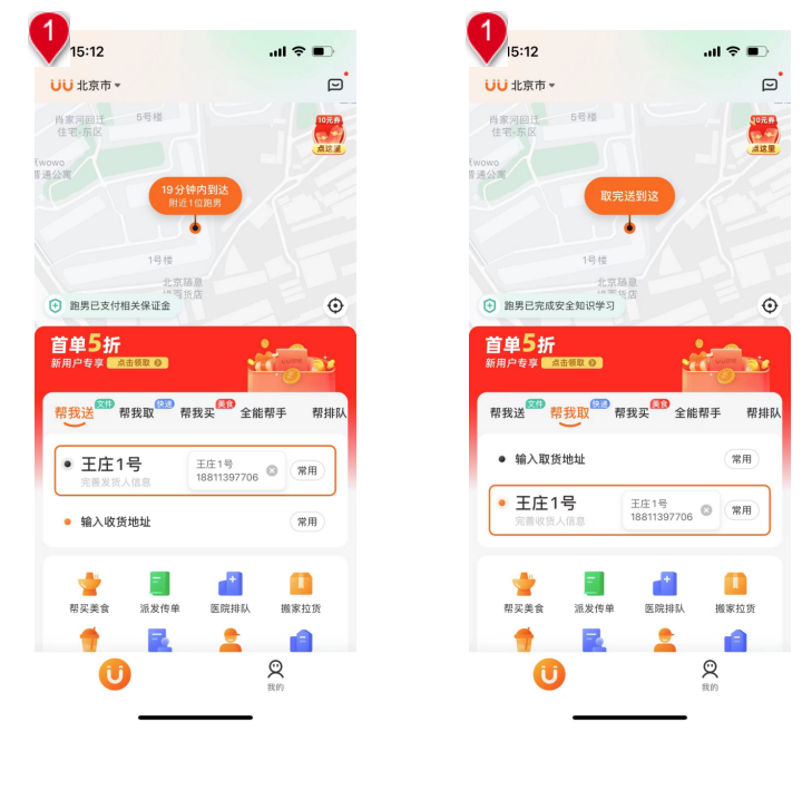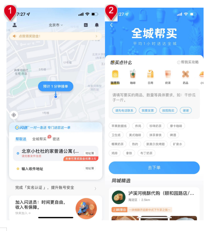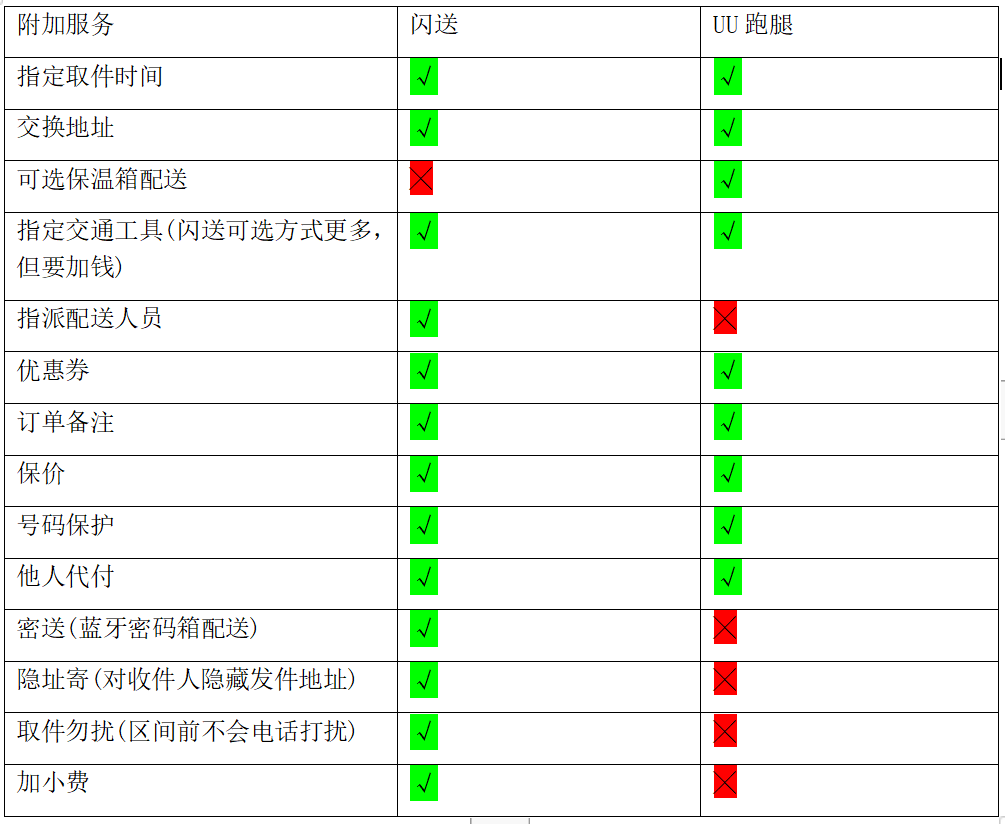 闪送首页的帮取送是一体的,因为两个功能的业务流程是一样的,用户通过在首页点击发件信息或者收件信息,决定第二层页面的初始展示情况,而且该页面发件信息和收件信息可以切换填写,第三层页面填写物品信息,第四层页面选择附加服务并且付款。合理。UU跑腿用户在首页可以选择帮取还是帮送,展示效果只是红框位置不同,他默认用户下单帮送需要优先填写发件人信息,下单帮取需要优先填写收件人信息,这样是不符合用户使用逻辑的,比如:用户在下单帮送是,提前在微信复制了收件人信息,打开UU跑腿更可能优先粘贴收件人信息。而且帮取和帮送在业务流程上没有任何区别,UU跑腿的这个设计却让用户多点击了一次。UU跑腿用户输入寄收件地址用了2、3、4、层三个页面,比闪送多了两个页面,这个设计有点多此一举了,闪送用户下单过程向下进了3层,而UU跑腿向下进了5层。而且第五层的物品信息弹框会被一些提示信息打断而不自动弹出,需要用户再次填写。差距。闪送首页的“密送”也可以作为普通取送的附加服务来选择,“密送”与“普通取送”可以相互转化,其他操作相同,不再多分析。闪送2014年上线,UU跑腿2015年上线,但是很明显,闪送可选的附加服务更多,用户下单体验更好,这也是闪送市场占有率大幅碾压UU跑腿的原因之一。这里插一小点,用户支付失败的情况下,闪送跳转到当前订单未完成页面,而UU跑腿跳转到首页,虽然有待支付订单提醒,但是会打断成交过程。如果一直不支付,闪送会在自动取消前5分钟给用户发短信提醒,自动取消后也会发短信提醒,而UU跑腿什么也没做。这点也需要向闪送学习。(2) 帮买功能