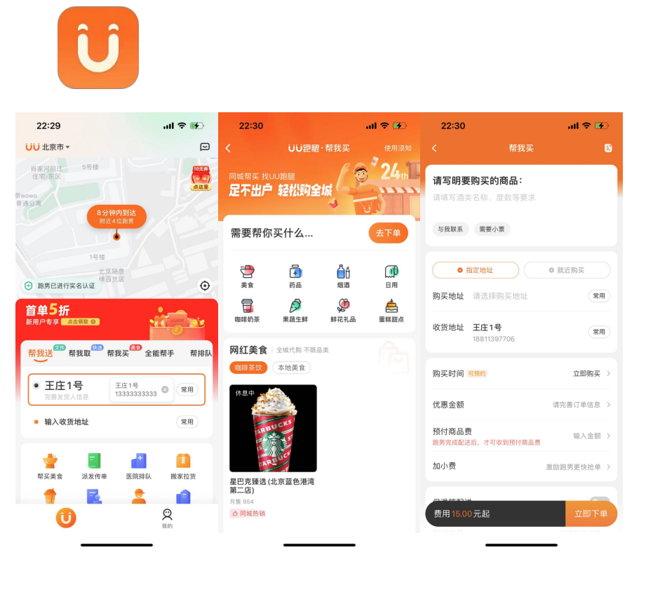 在使用过程中,简洁又主次分明的页面不让用户想,加合理的业务流程提高了效率,不让用户等,对功能的辅助描述和提示有很好的防错防呆的作用,合理合时的宣传文案提升了品牌认知,整体设计很优秀。UU跑腿主打“3U”理念:“有温度”、“有速度”、“有态度”,橙红色的主色调代表温暖与活力,是活跃的催化剂给神经和血液以力量,让人产生温暖、热情的感觉,与UU跑腿热情积极的服务理念很贴切。不过橙色也是最容易造成视觉疲劳的颜色。而且各个页面上方都是大片橙色,部分页面会感觉头重脚轻。