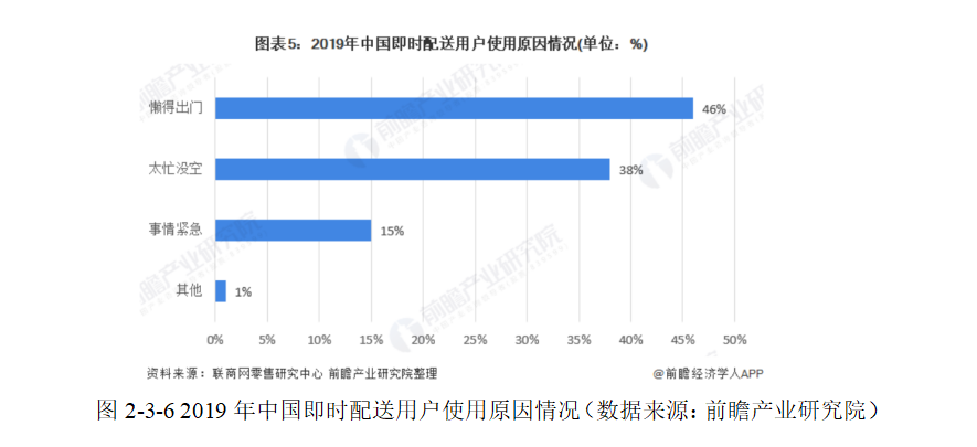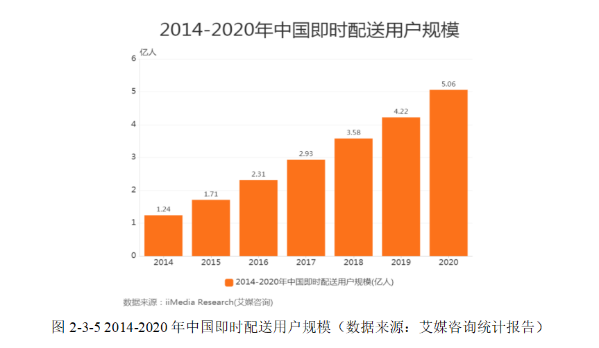 (1) 订单多,规模大,爆发式增长过后,实现稳定增长,但增速放缓即时物流行业规模主要从两个方面来体现,一个是行业的订单量,另一个是交易金额。如图2-3-1所示,2015年至2020年我国即时物流行业规模一直呈现增长趋势,即时物流的订单量从27.7亿单增长到2020年的243.7亿单。从图2-3-2可看出,交易金额从2015年的240亿元增长到2020年的1701亿元。短短几年时间,即时物流行业就发展成为了一个千亿级的市场。目前行业仍处于稳定增长阶段。2015年即时物流行业随着外卖O2O的兴起实现了一段时间的爆发式增长,而近两年来随着外卖用户的逐渐稳定以及外卖市场扩张的放缓,即时物流行业也已经度过爆发期,增速逐年降低。(2) 外卖是最主要的驱动业务,非配餐比重持续扩大从宏观角度来划分,即时物流行业的订单类型可分为餐配和非餐配,其中,餐配是指餐饮外卖配送服务,非餐配指线上线下融合而带来的零售订单、电商订单、跑腿等即时物流服务。从图2-3-3可以看出,2018年我国即时物流行业中,非餐配订单量占比只有22.5%,而餐配订单量占比高达77.5%,由此可知,餐饮外卖行业是即时物流服务的支柱性行业,外卖配送为即时物流行业提供大量持续的订单,是即时物流行业发展的源泉。由于外卖用户的逐渐稳定以及外卖市场扩张的放缓,即时物流企业也开始寻求除餐配以外新的业务方向。如图2-3-4所示,2013年到2020年商超宅配的市场规模逐年上升,意味着除了刚开始的外卖订单,即时物流的服务领域越来越广,这背后是因为新零售的崛起。新零售将线上服务、线下体验结合在了一起,为消费者提供一种全渠道的服务,短时间配送的即时物流是新零售发展的保障,因此,即时物流的订单越来越多来自新零售、商超宅配等领域。即时物流的服务品类持续扩充,需求量也逐渐增加,导致行业物流成本提升,侧面反映整个即时物流行业走势良好,拥有巨大发展空间。(3) 因为“太懒、太忙”,用户群体规模稳步增长,需求不止外卖即时配送行业面对的最终客户都是C端消费者,因此其客户基数大,由于经济、技术、“懒人经济”、疫情等因素,呈现出快速增长状态。统计数据表明,近7年即时配送行业用户的规模保持稳步增长,增速保持在20%以上。其中,2020年整个行业用户规模约为5.06亿人,用户基数的增长为行业整体规模的扩大奠定了基础。80后、90后和00后越来越成为中国消费的主力军。他们对价格敏感度降低,购买意愿更强,随着收入增加,更加注重商品和服务的品质、品牌,以及生活质量,有个性化服务需求,紧跟风尚,敢于尝鲜,需求不止外卖。这为本地生活服务行业发展带来了巨大需求和市场前景。值得注意的是跑腿帮办类即时物流业务发展强劲,帮买帮送模式基本成熟并逐渐被消费者接受,增长势头强劲,为众多即时配送业务当中最为活跃的板块。据统计,2019年我国即时配送用户使用即时配送的主要原因为懒得出门和太忙没空,其中懒得出门用户比重达46%,太忙没空的用户比重达38%,事情紧急用户比重为15%。原本被称为“懒人经济”的到家O2O类服务,在疫情的影响下,逐渐转变为生活刚需。