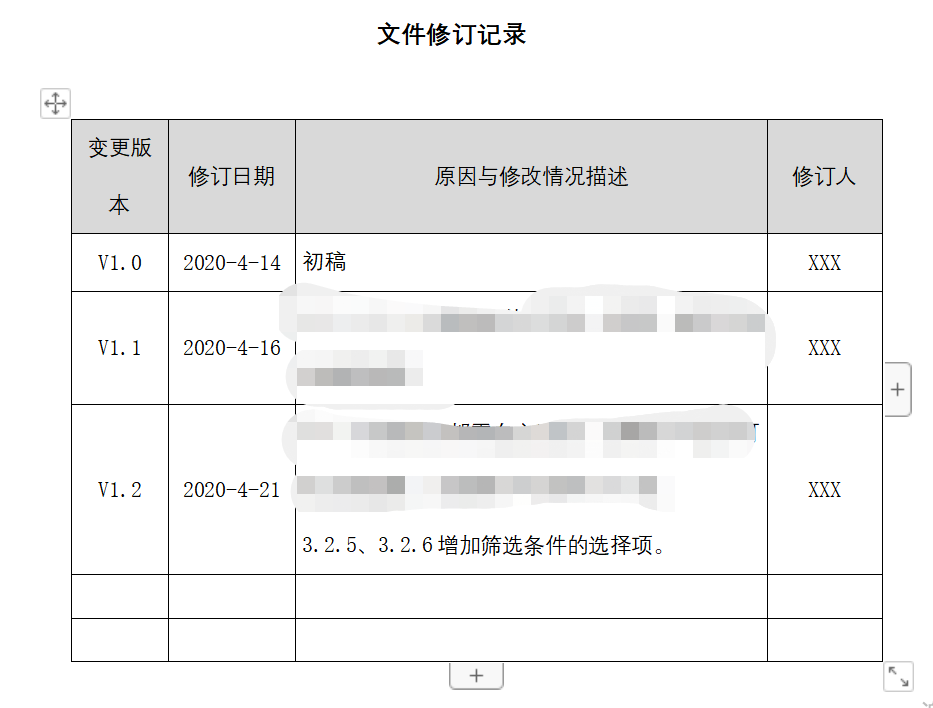 首先是变更的版本,然后是修订日期、原因与修改情况描述、修订人。